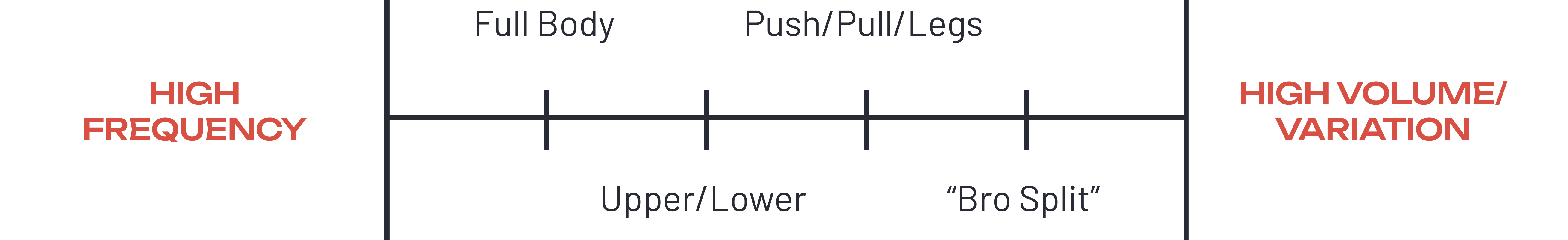 I like to think about these splits lying on a spectrum. At one end of the spectrum, you have the variable of Frequency; the number of times per week that each muscle group is trained. At the other end of the spectrum, there are two variables: Volume and Exercise Variation. Volume is the amount of “work” done for each major muscle group. It can be defined as the combination of Sets x Reps, but in this context, it refers simply to the number of Sets done for each muscle group within each week block. Exercise Variation, which can often come along with additional Volume in this context, is the number of different exercises performed for each muscle group within the week.
